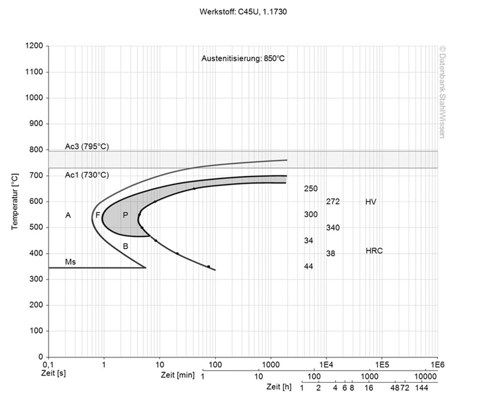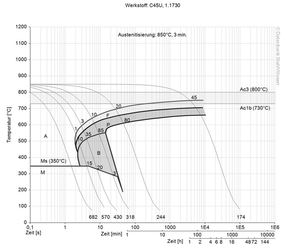 This diagram shows the structural changes at the micro level over time at a constant temperature. It shows at what temperature and after what time different phases, e.g. perlite, martensite or bainite, begin to form.