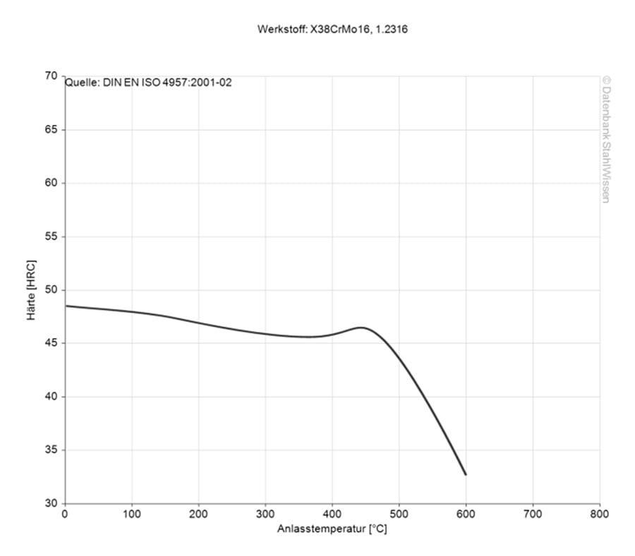 To harden material 1.2316, it is heated evenly to a temperature of 1020 – 1050 °C and held there for approx. 15 – 30 minutes. The material should then be quenched.