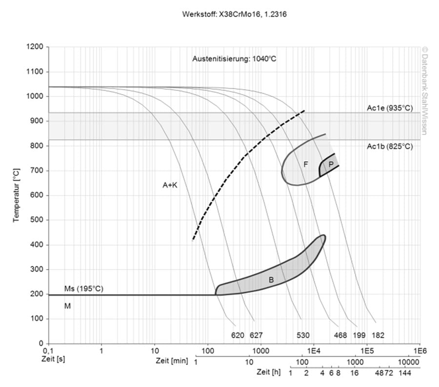 This diagram shows micro-changes over time at different temperatures. These are important in heat treatment, as they provide information about the optimal conditions for processes such as hardening, annealing and normalising.