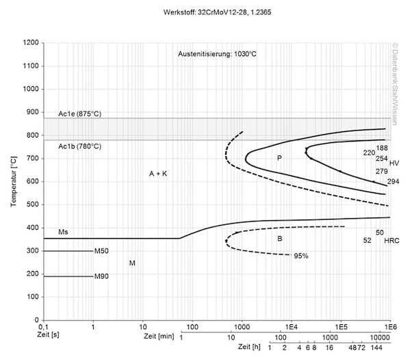This diagram shows the structural changes at the micro level over time at a constant temperature. It shows at what temperature and after what time different phases, e.g. perlite, martensite or bainite, begin to form.