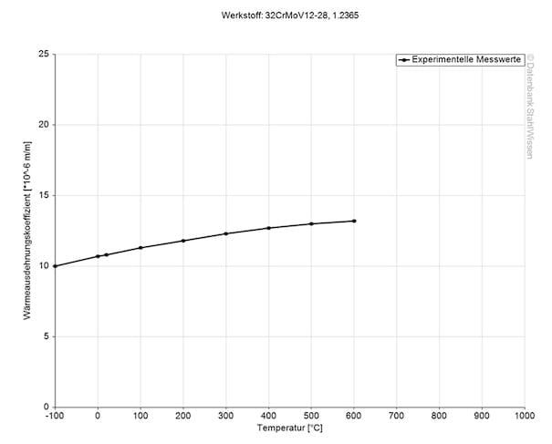 The following table shows the heat conductivity for tool steel 1.2365 at various temperatures.