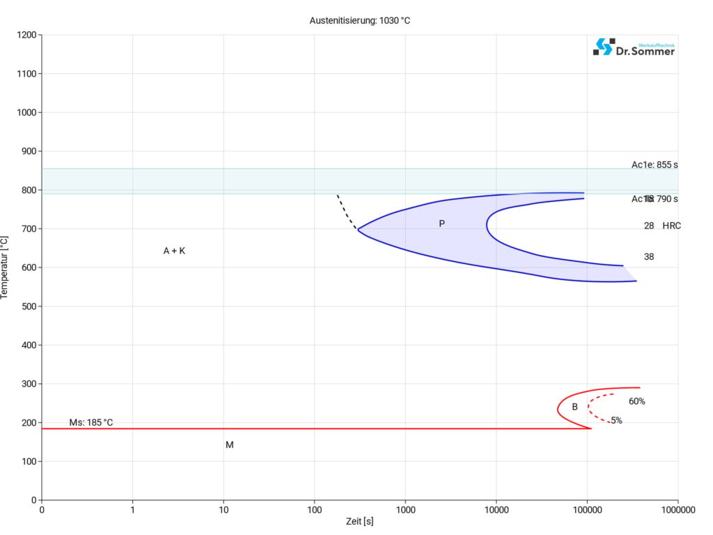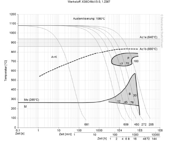 This diagram shows the structural changes at micro level over time at a constant temperature. It shows at what temperature and after what time different phases, e.g., perlite, martensite or bainite start to build.
