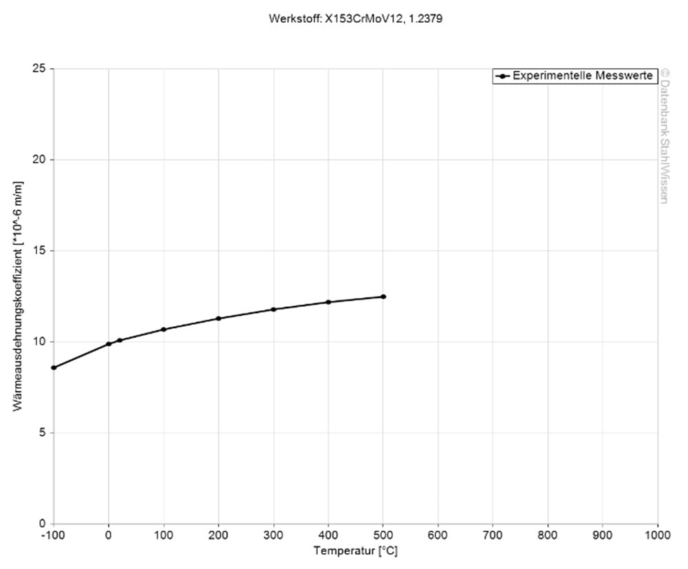 The 1.2379 thermal expansion coefficient shows how much a material expands or contracts at temperature changes. This information can very important when working with high temperatures or during applications with stark temperature changes during an application.
