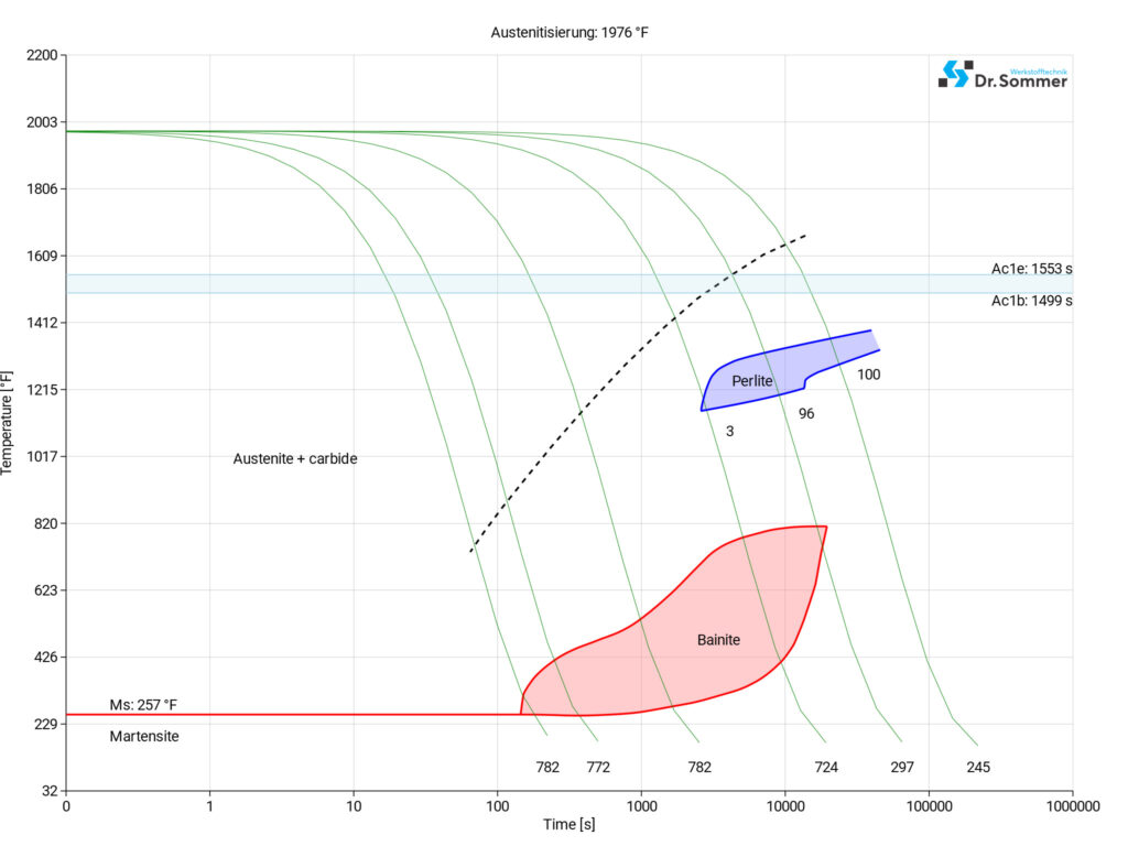 This diagram shows the structural changes at micro level over time at a constant temperature. It shows at what temperature and after what time different phases, e.g., perlite, martensite or bainite start to build.