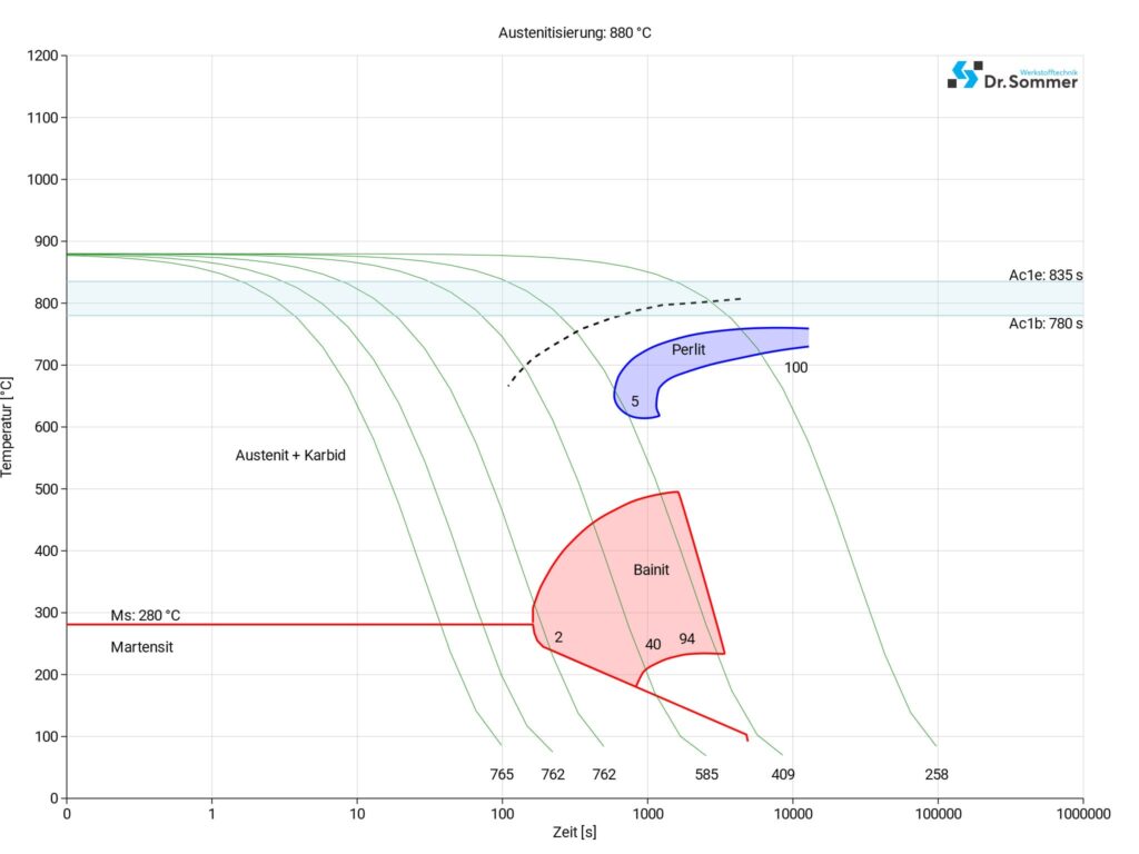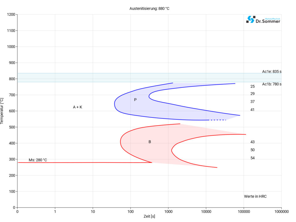 This diagram shows the structural changes at micro level over time at a constant temperature. It shows at what temperature and after what time different phases, e.g., perlite, martensite or bainite start to build.