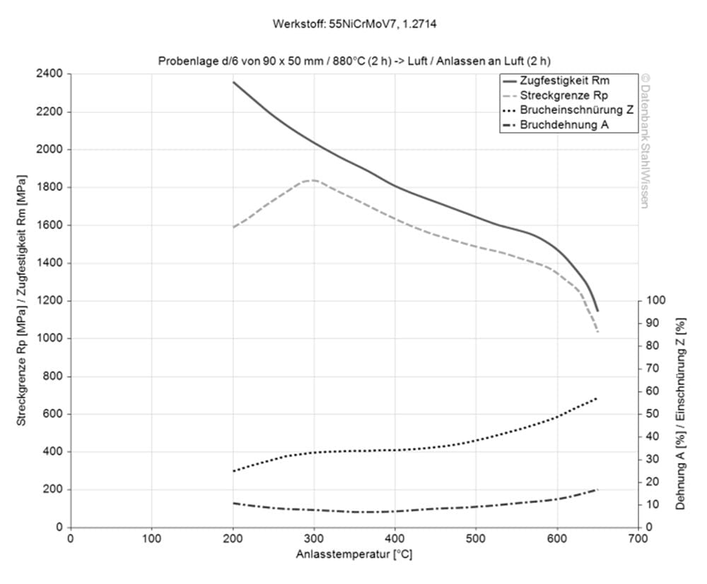 1.2714 tool steel has a tensile strength of approx. 850 N/mm2. The tensile strength indicates the maximum load capacity. To obtain this information, a tensile test is carried out to show how much force is required to stretch or elongate a sample before it breaks.