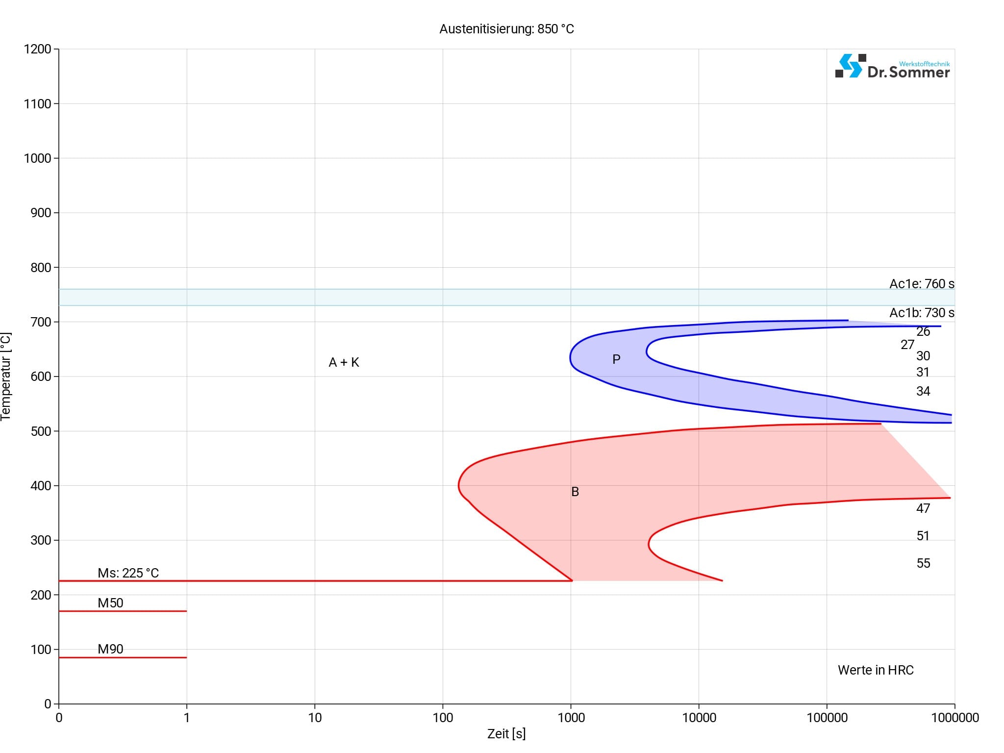 This diagram shows the structural changes at the micro level over time at a constant temperature. It shows at what temperature and after what time different phases, e.g. perlite, martensite or bainite, begin to form.