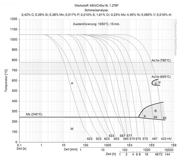 This diagram shows the structural changes at the micro level over time at a constant temperature. It shows at what temperature and after what time different phases, e.g. perlite, martensite or bainite, begin to form.