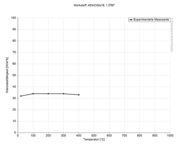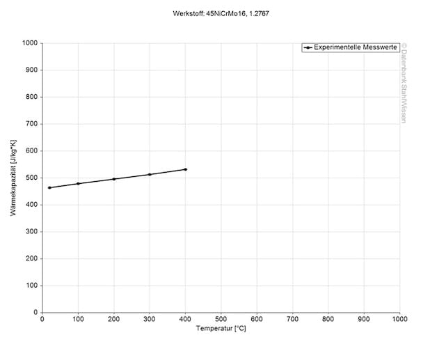 The specific heat capacity of tool steel 1.2767 at room temperature is 0,46 J/kg*K. This value shows how much heat is needed to heat a specific amount of material by 1 Kelvin.