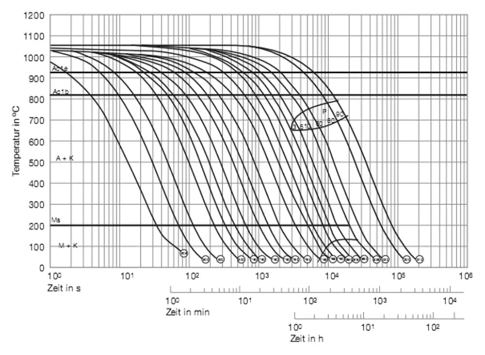 This diagram shows micro-changes over time at different temperatures. These are important in heat treatment as they provide information on the optimal conditions for processes such as hardening, annealing and normalising.