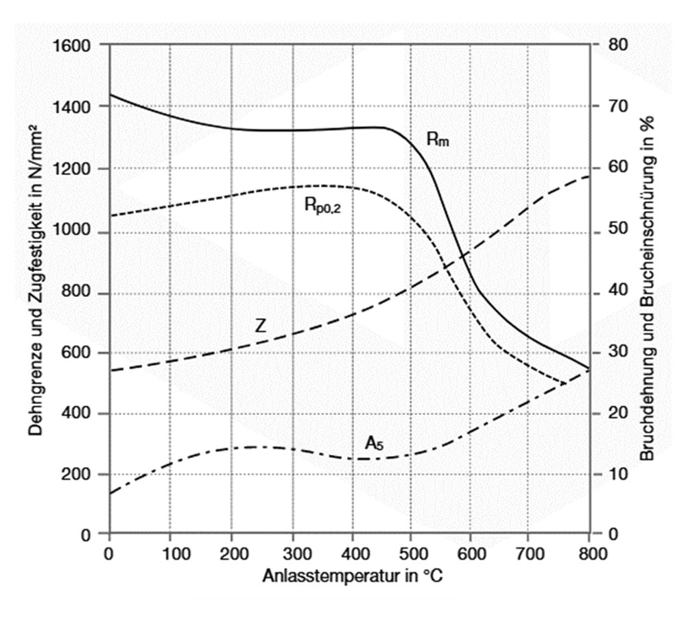 The workpiece should be preheated to 150 – 260 °C and annealed after welding to reduce possible cracking. Since grain formation is to be expected in the heat-affected zone, welding should be carried out with as low a welding energy as possible. Due to the high strength that can be achieved with this steel and the possibility of embrittlement, the use of hydrogen and nitrogen-containing gases during welding should be avoided.