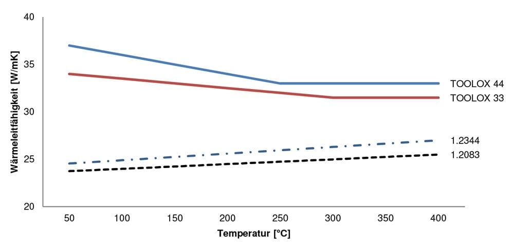 At room temperature the heat conductivity for Toolox 44 is at 28,0 W/(m*K).